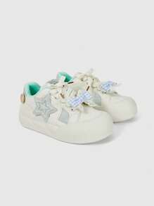 Kawaii Zapatos deportivos ligeros de suela blanda con cordones de moño azules, zapatos de tacón tipo Mary Jane, bailarinas dulces para mujer