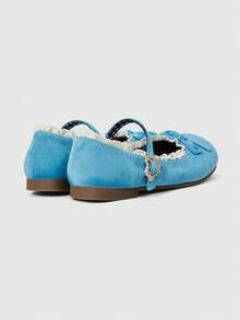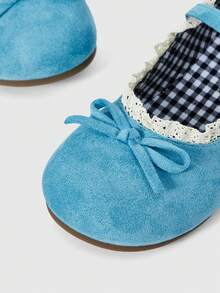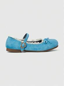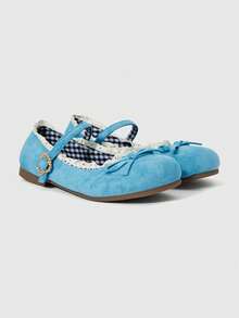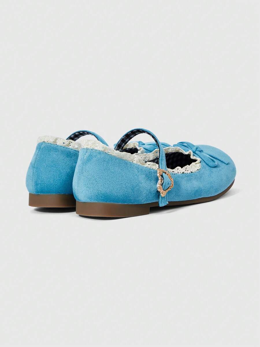 Kawaii Zapatos de mujer tipo Mary Jane azules, mocasines de punta cerrada, bailarinas tipo Lolita con lazo y encaje