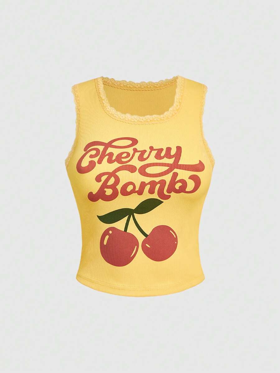 Kawaii Camiseta de tirantes casual de mujer con estampado de cereza, verano