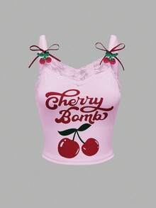 Kawaii Camiseta de tirantes casual de mujer con estampado de cerezas y ribete de encaje