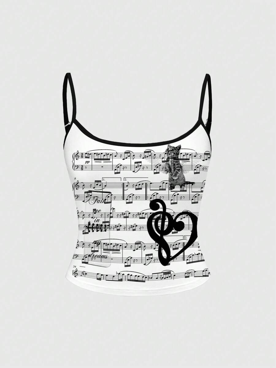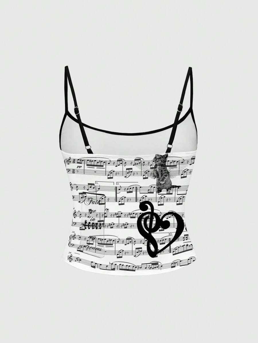 Kawaii Camiseta de tirantes con estampado de notas musicales, de uso casual y versátil para el día a día