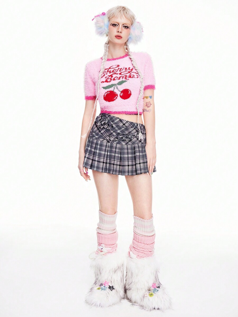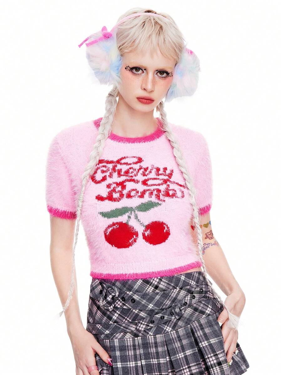 Kawaii Suéter ajustado de manga corta con cuello de tripulación y estampado de cerezas para mujer