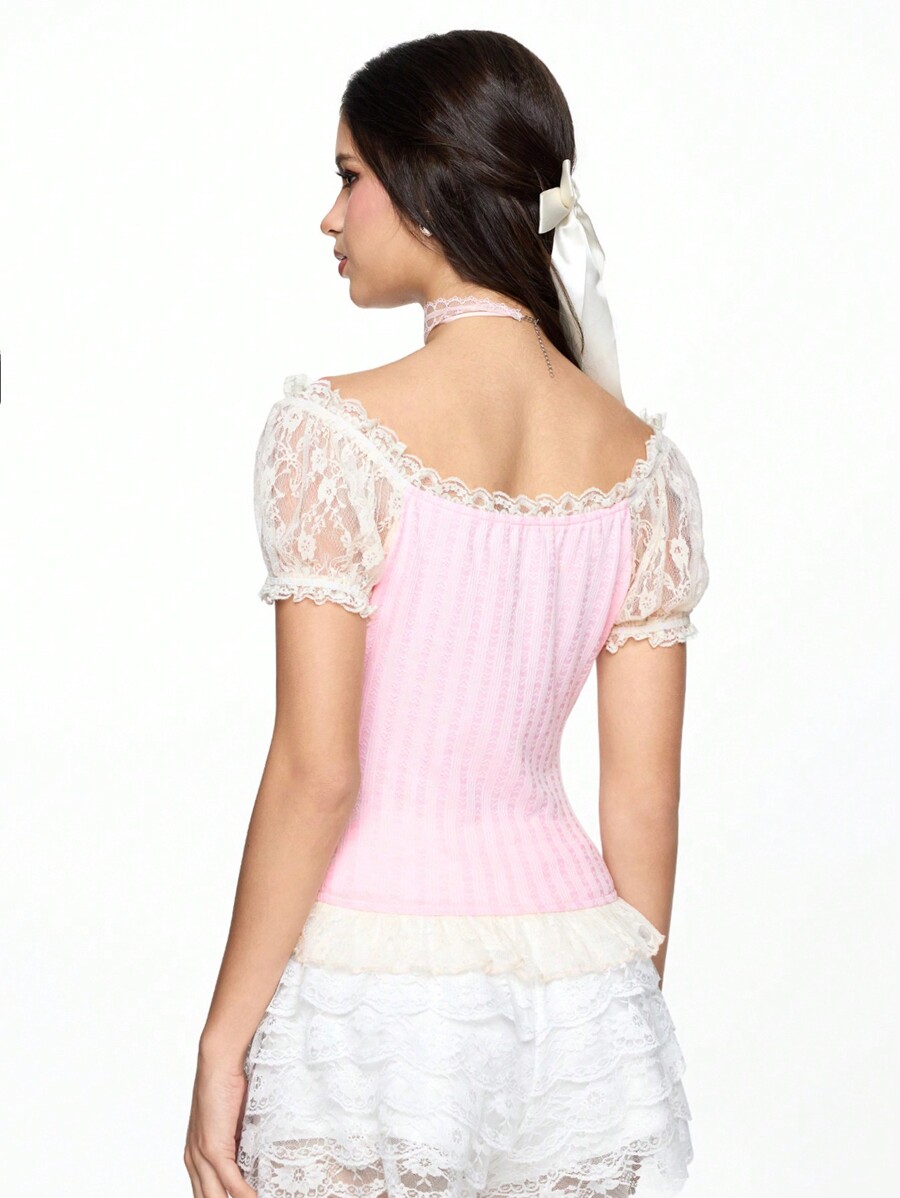 Kawaii Camiseta de mujer con lazo y encaje en 2 en 1