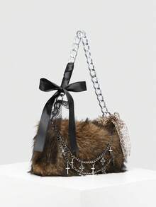 Kawaii Bolso de hombro/cruzado de mujer con capacidad grande, de pelo largo artificial, con estampado de leopardo y ciervo, de moda retro Y2K, grueso para otoño/invierno