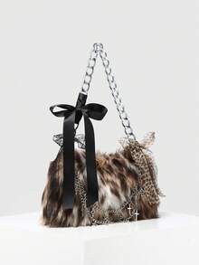 Kawaii Bolso de hombro/cruzado de mujer con capacidad grande, de pelo largo artificial, con estampado de leopardo y ciervo, de moda retro Y2K, grueso para otoño/invierno