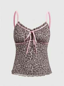 Kawaii Top de tirantes de verano estampado de leopardo con bloqueo de color, lazo y cinta para mujer de talla grande, escuela