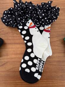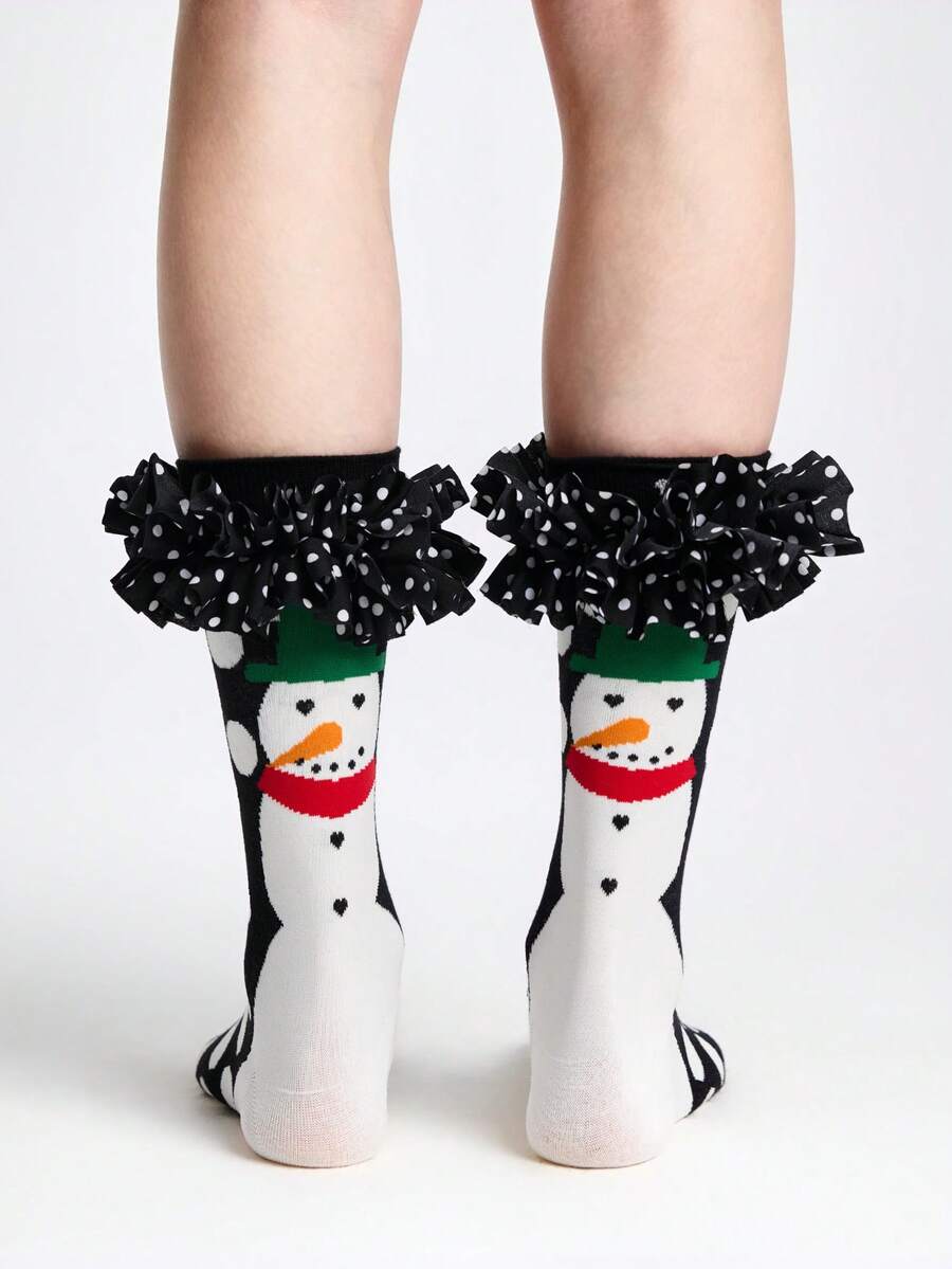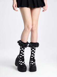 Kawaii Calcetines de tripulación lindos con estampado de lunares, empalme de malla y ribete de volantes para mujer