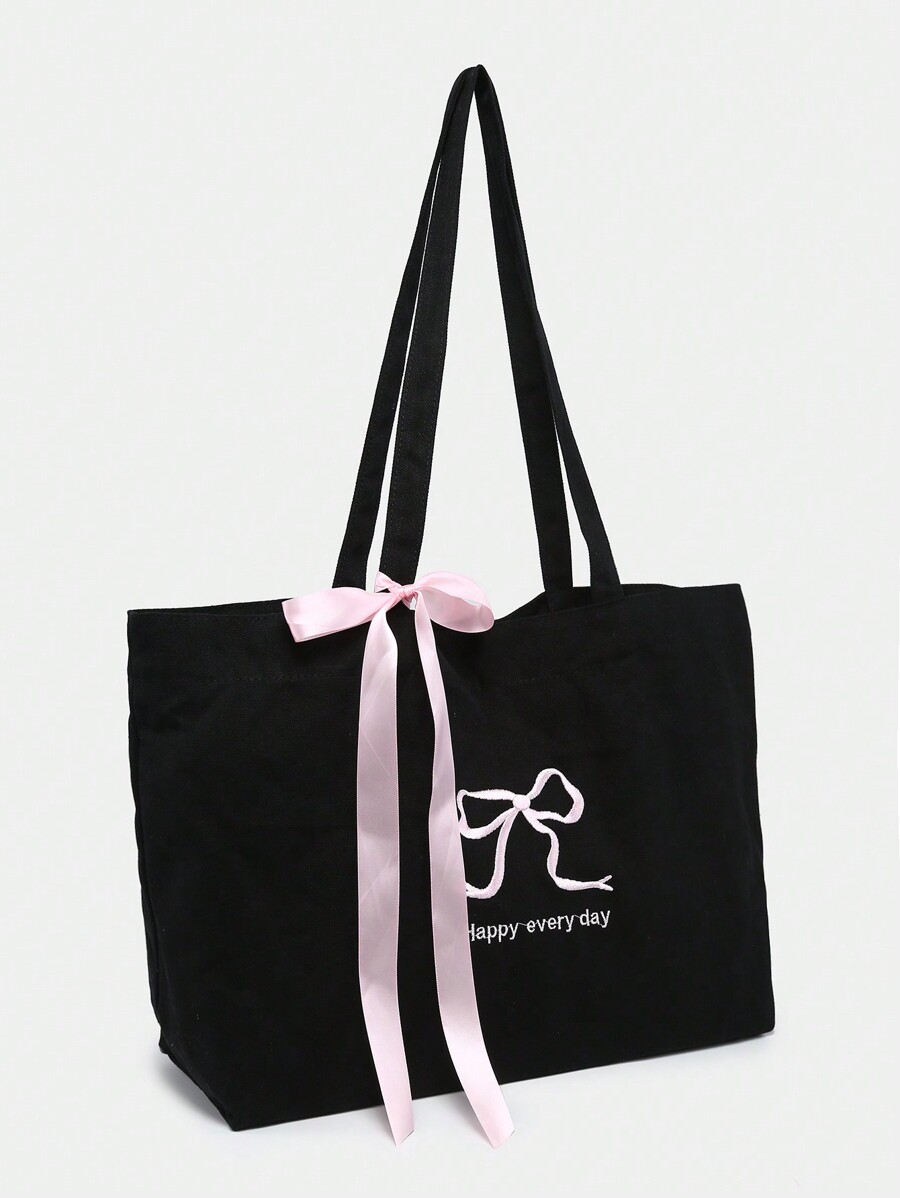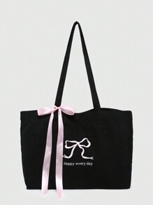 Kawaii Bolso tote de gran capacidad con correa de lazo de moño retro y bordado con eslogan en inglés para mujeres, adecuado para ir de compras o para la escuela