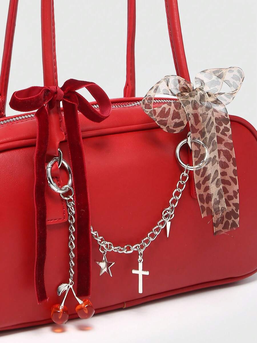 Kawaii Bolso de hombro/axilar con bolsillos múltiples estilo Bostón, con diseño de cuadros retro, lazo y decoración de corazón de cereza