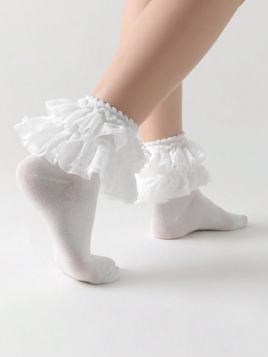 Kawaii Calcetines de unicolor con volantes de encaje hasta la pantorrilla para mujer