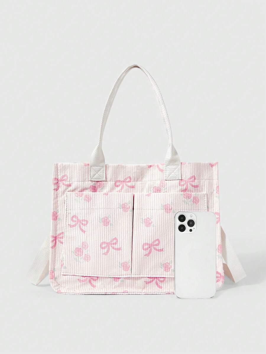 Kawaii Bolso de tela de pana blanco espacioso para mujer - Bolso convertible de mano/bandolera/hombro con estampado de lazo y flores