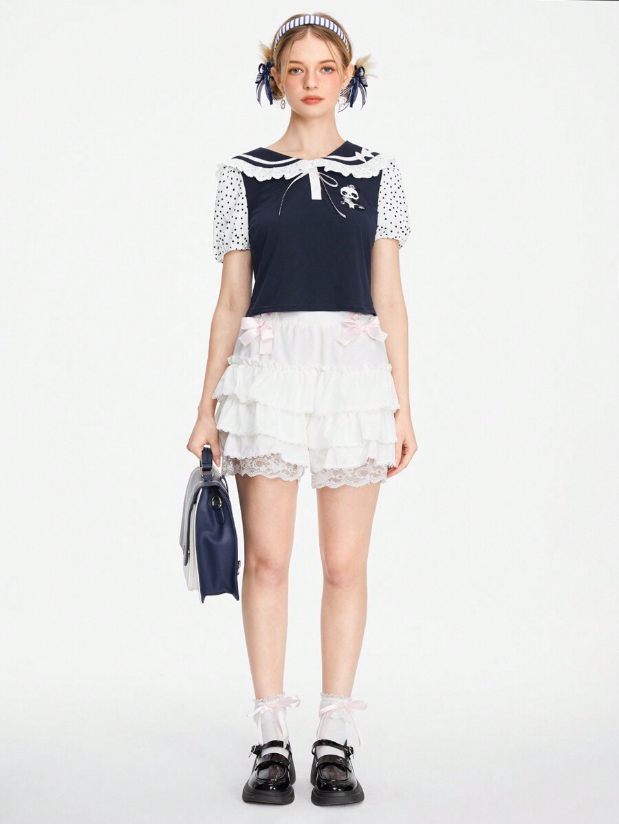 Kawaii Camiseta de manga corta con estampado de lunares y oso panda, cuello azul marino, para mujer, verano, escuela