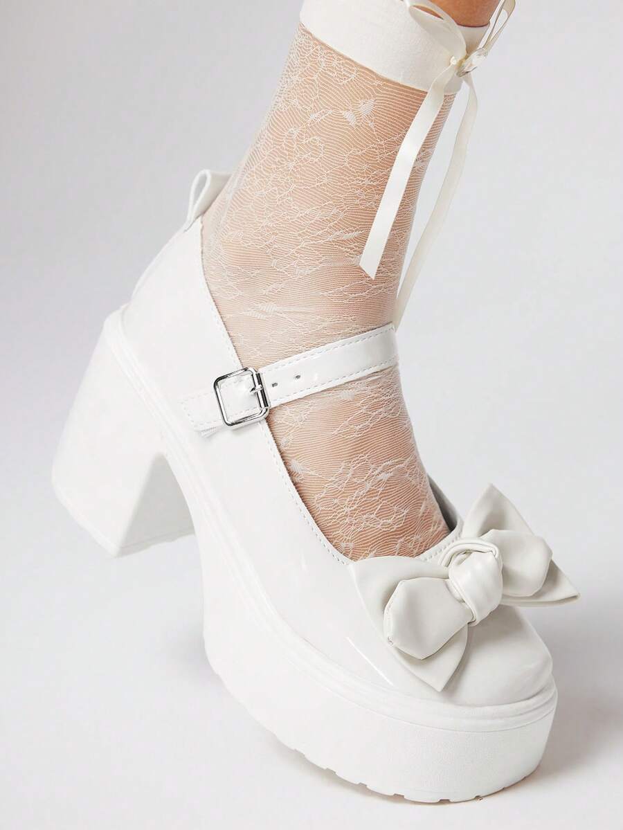 Kawaii Bombas con punta cerrada de tacón alto de mujer en blanco, oxfords de tacón grueso con decoración de moño, zapatos de estilo uniforme escolar japonés dulce, tacones formales para el trabajo