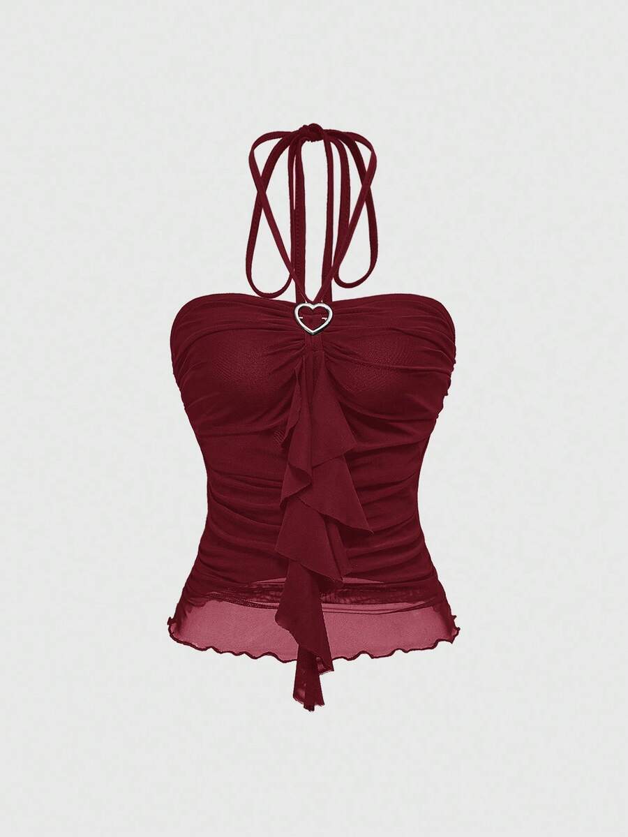 Kawaii Camiseta de tirantes con cuello halter, plisada y con volantes en estilo patchwork Y2K para mujer