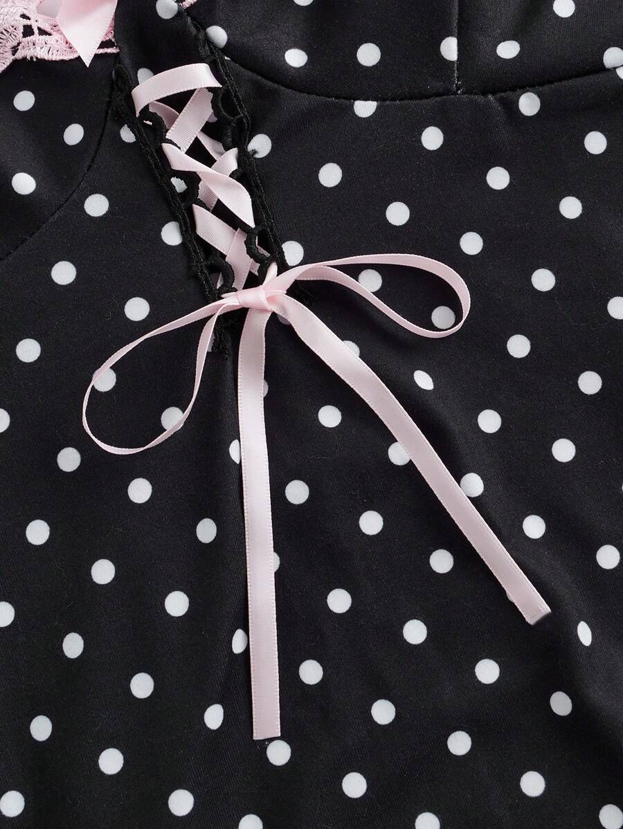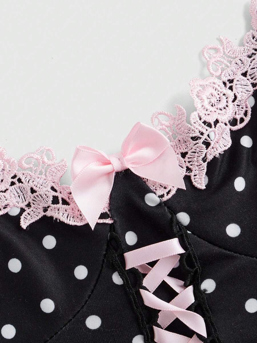 Kawaii Vestido mini elegante y encantador con ajuste ceñido, con camisola con encaje de lunares, para mujeres, escuela