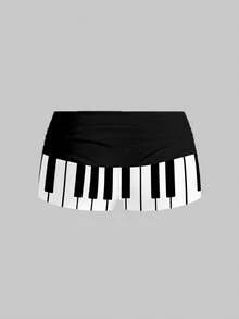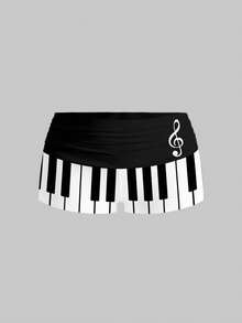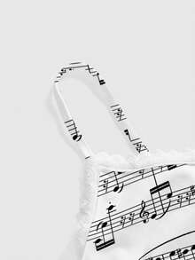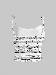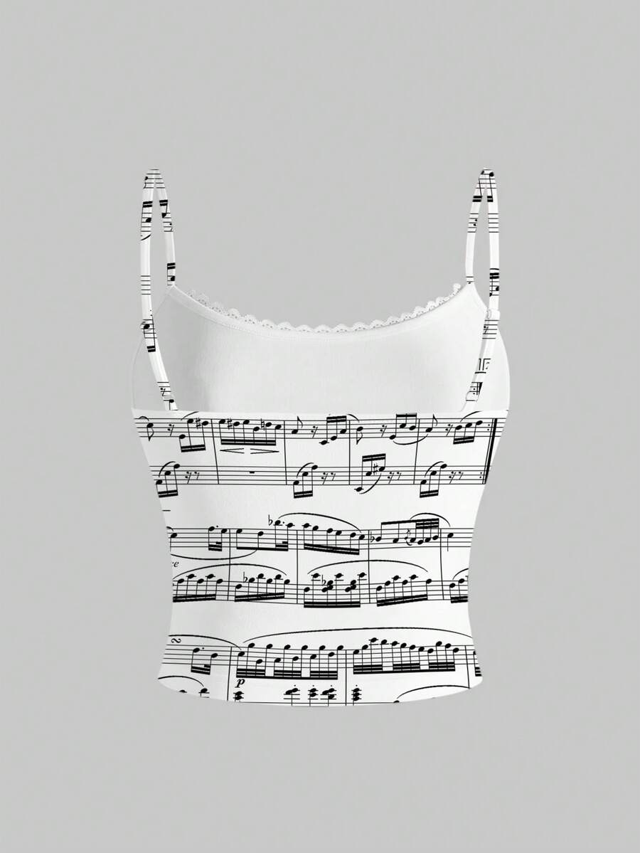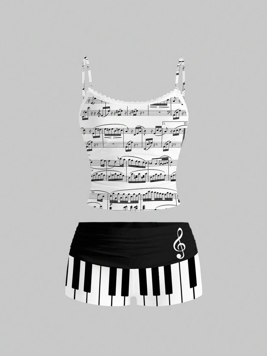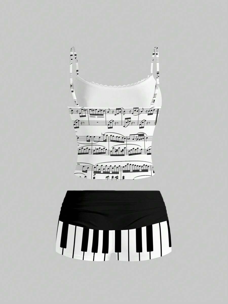 Kawaii Conjunto de top corto y shorts con estilo Y2K, estampado de notas musicales y piano, en negro y blanco, con tirantes finos, revelador, moda coreana