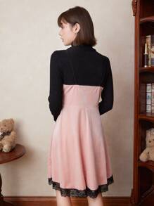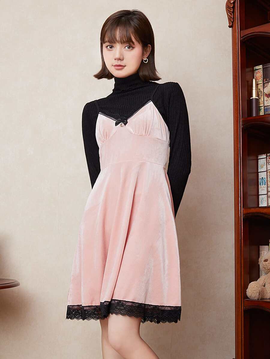Kawaii Vestido De Terciopelo Estilo Cami Con Encaje Sin Parte Superior