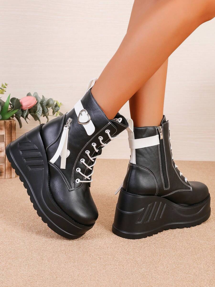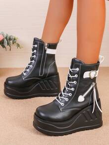 Goth Botas con cordón delantero con cremallera lateral de mujeres mitad de la pantorrilla