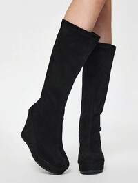 Botas cómodas y versátiles para mujer con suela gruesa, puntera redonda y sin cordones, de color negro y hasta la rodilla