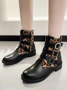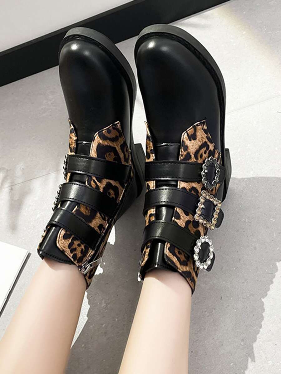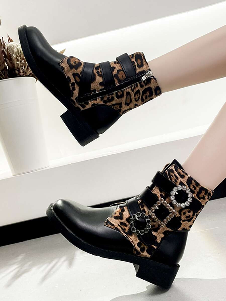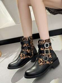 Botas de combate con patrón de leopardo con diamante de imitación & con diseño de hebilla con tacón grueso