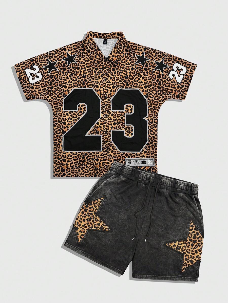 Street Life Conjunto de camisa de manga corta y shorts con cordón de cintura con estampado de leopardo para hombre