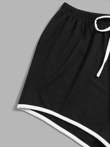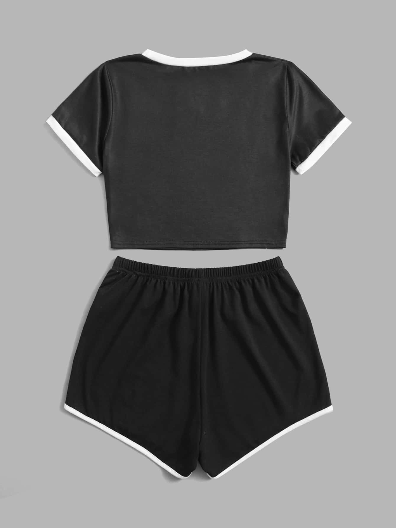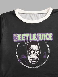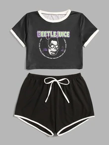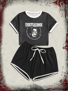 WB Horror | ROMWE Conjunto de pijama con letra con estampado de dibujos animados unido en contraste con diseño de lazo