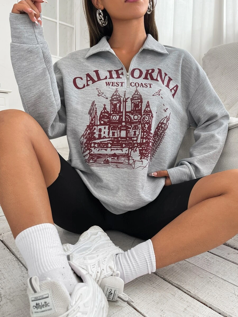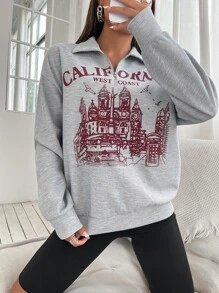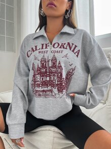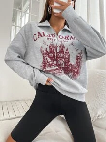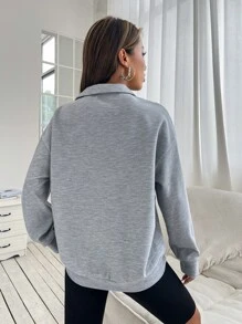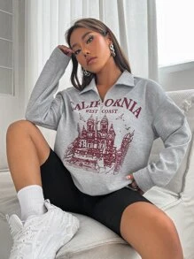 Sudadera con estampado de letra con cremallera media de hombros caídos