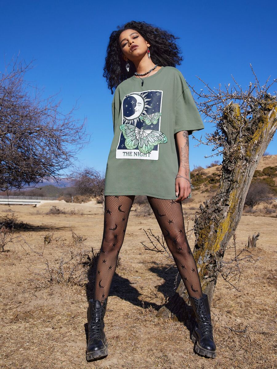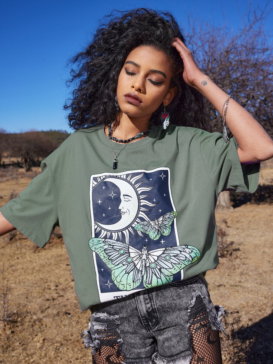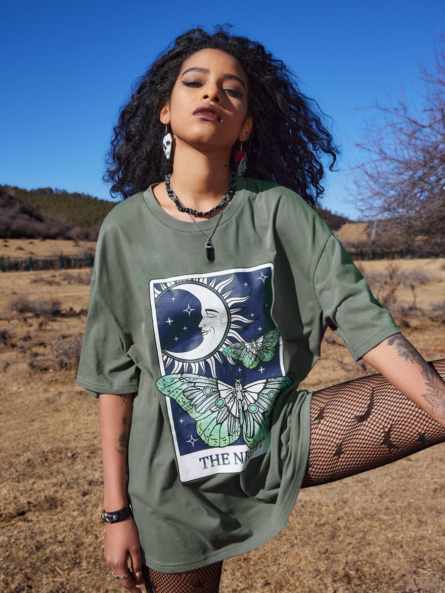 Goth Camiseta amplia con letra luna & con estampado de mariposa
