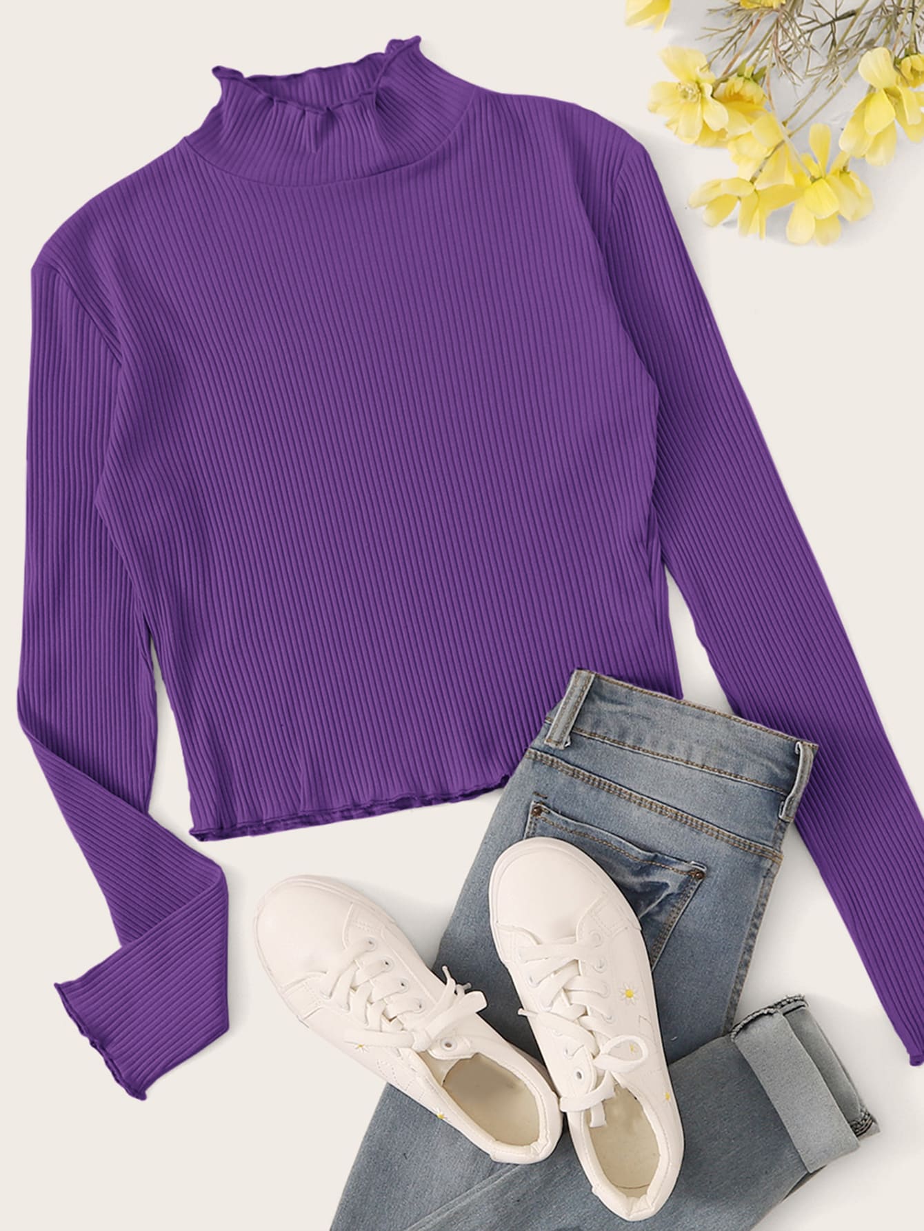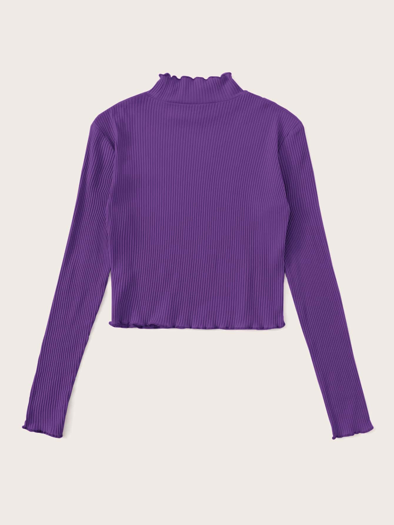 Camiseta de canalé de cuello alto ribete en forma de lechuga