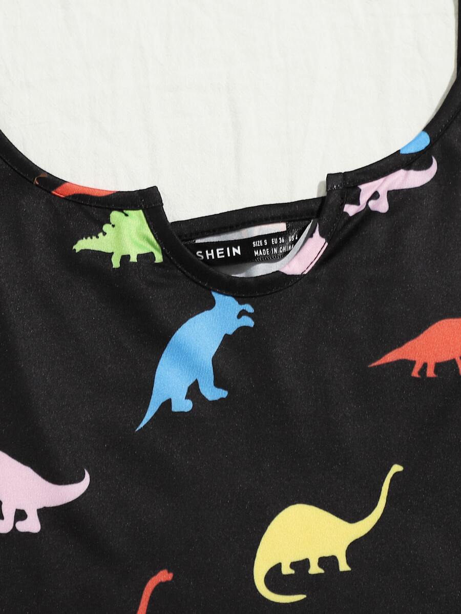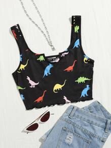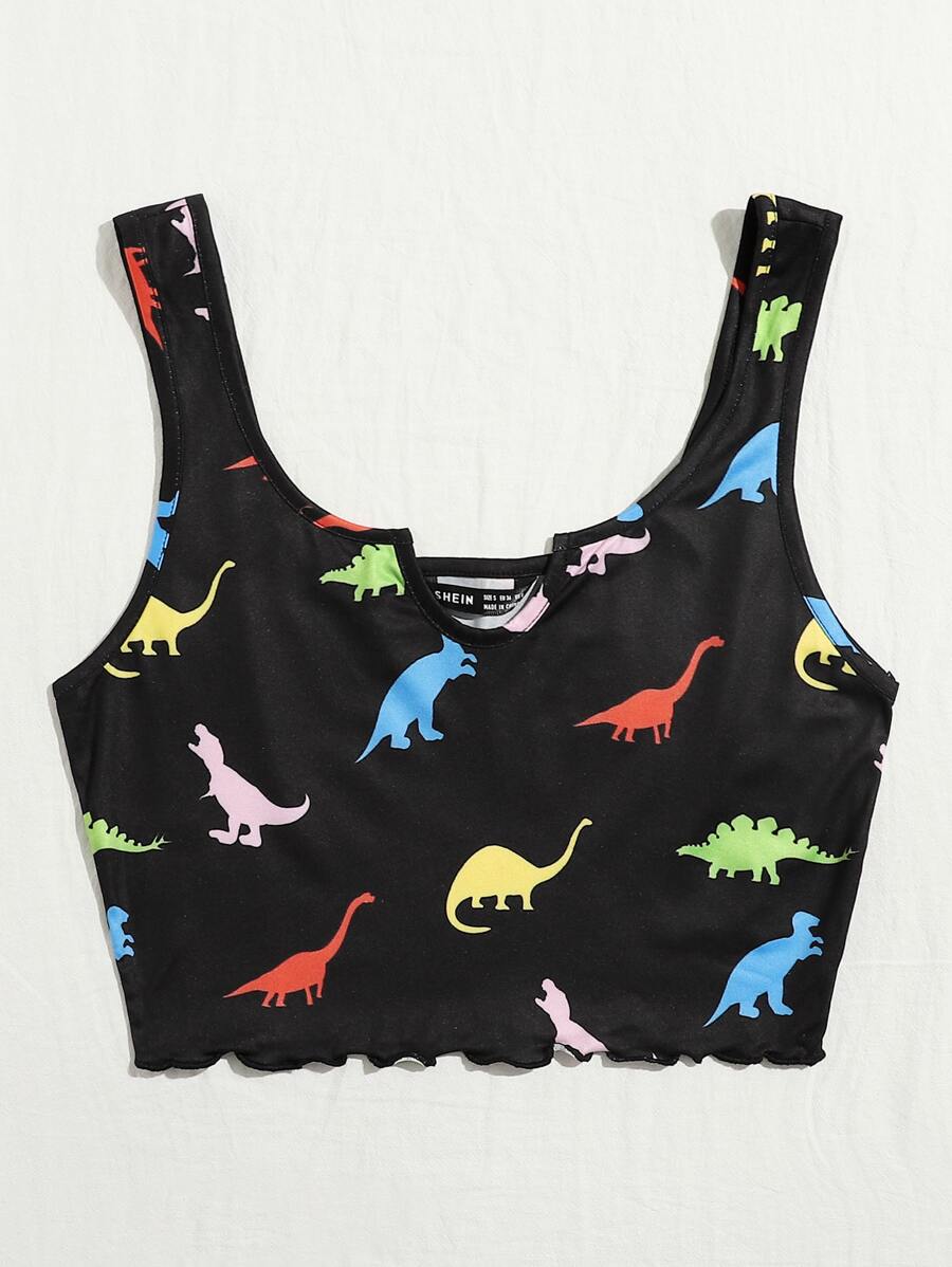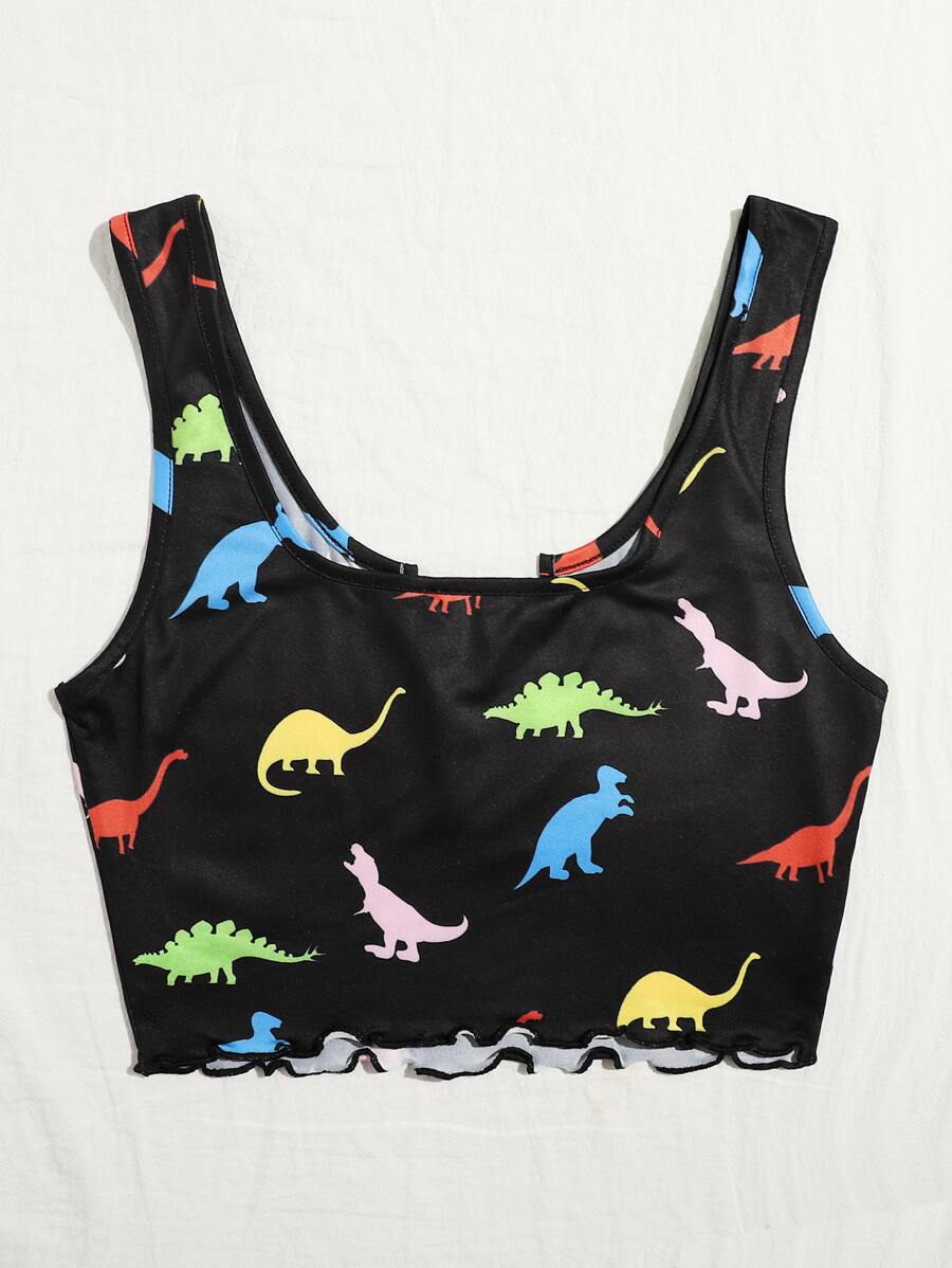 Tank top corto ribete en forma de lechuga co nestampado de dinosaurio