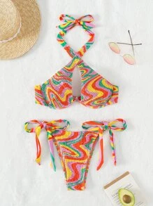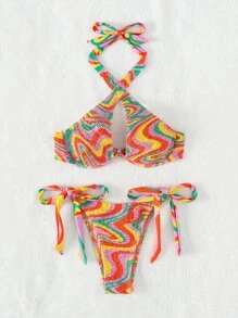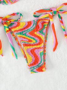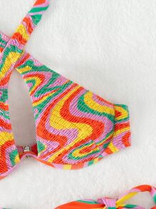 Conjunto de bikini de verano de playa con sujetador de varillas y escote halter fruncido con estampado de mármol