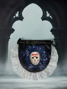 Friday the 13th X ROMWE Bolsa con cordón de gran capacidad con estampado de máscara, bolsa de cosméticos