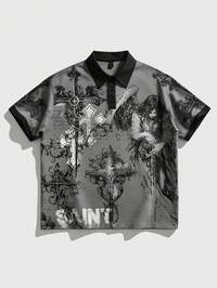 Goth Camisa casual de manga corta con estampado de cruz y calavera de solapa única para hombres