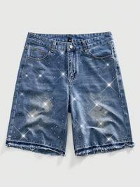 Street Life Pantalones cortos vaqueros casuales para hombre con borde deshilachado y adornos de cristal