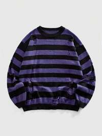 Suéter de manga larga con gráfico de bloque de color, estilo callejero, con hombros caídos y rasgado, de rayas para hombre, para vacaciones, amigos, suéter de punto de hombre, suéter de punto a rayas, suéter a rayas desgastado, suéter de cuello redondo a rayas para hombre, otoño e invierno