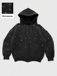 Casual Sudadera con capucha con cremallera y adornos de strass, unisex, para otoño