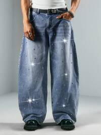 Street Life Jeans de pierna ancha con ajuste holgado y adornos de rhinestones para hombres