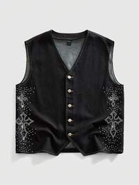 Street Life Chaleco vaquero casual versátil y de moda con decoración de cruz de rhinestone para hombres