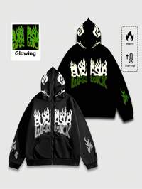 Street Life Sudadera con capucha casual de hombre con estampado de letras fluorescentes en la oscuridad y cierre de cremallera para otoño