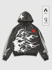 Street Life Sudadera con capucha y cremallera holgada para hombres con estampado de cráneos y llamas