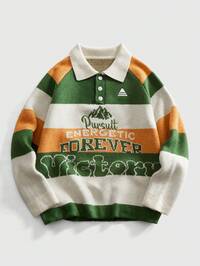 Street Life Suéter de manga larga de corte holgado con cuello polo, estilo casual de calle con patrón de rayas de contraste, estilo varsity para hombres