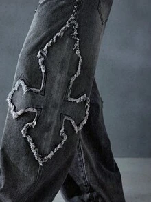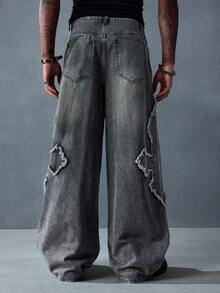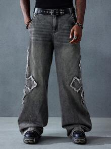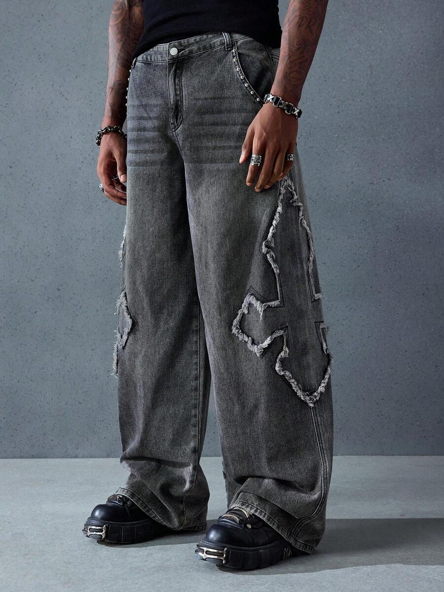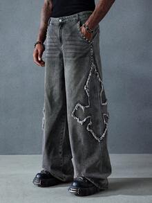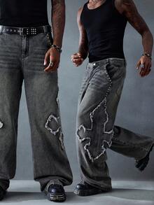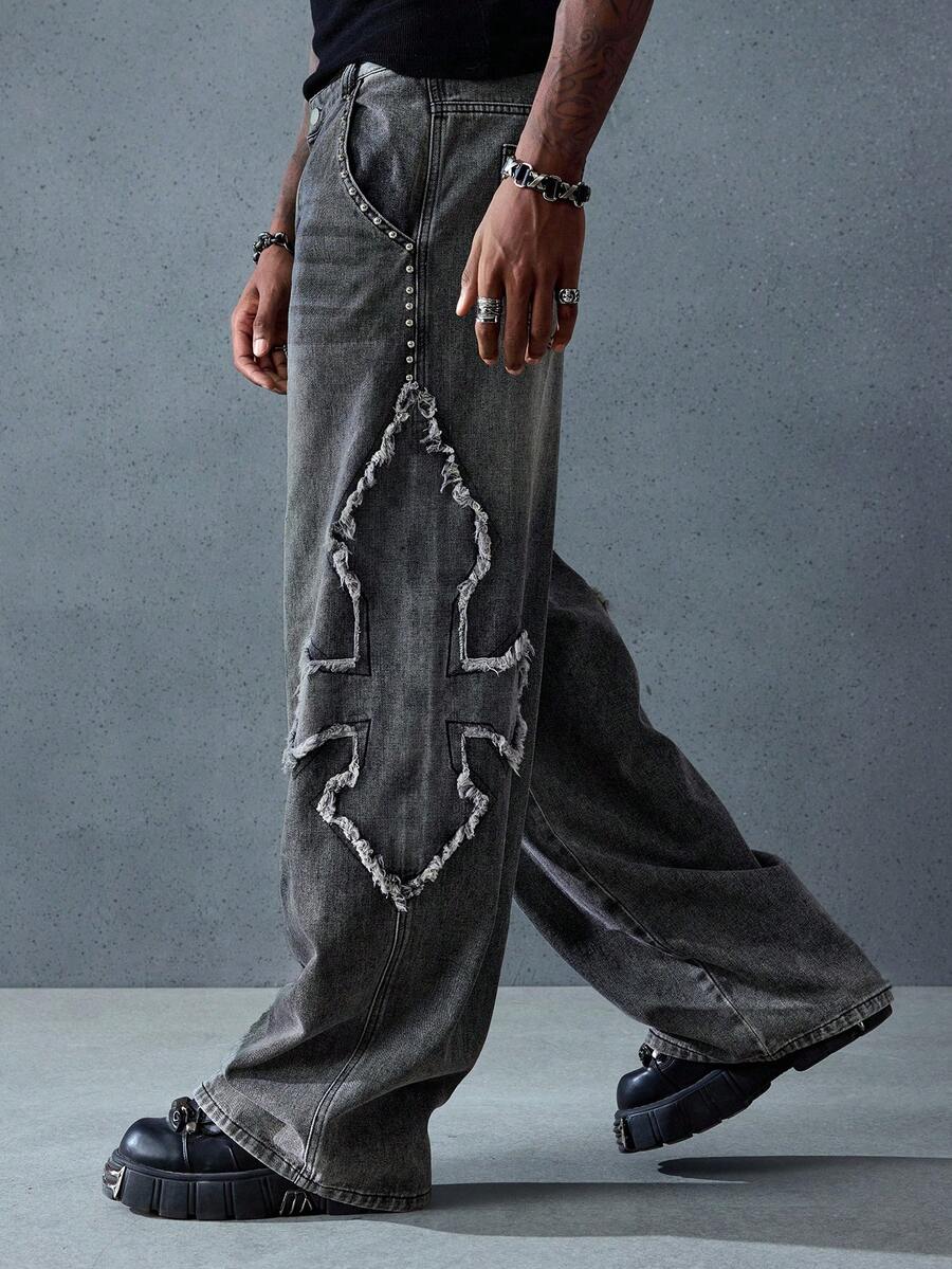 Street Life Jeans de pierna ancha para hombre con lavado casual, aplicación de cruz y decoración con tachuelas