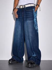 Grunge Punk Jeans de pierna ancha y corte holgado para hombre con diseño bordado de calavera