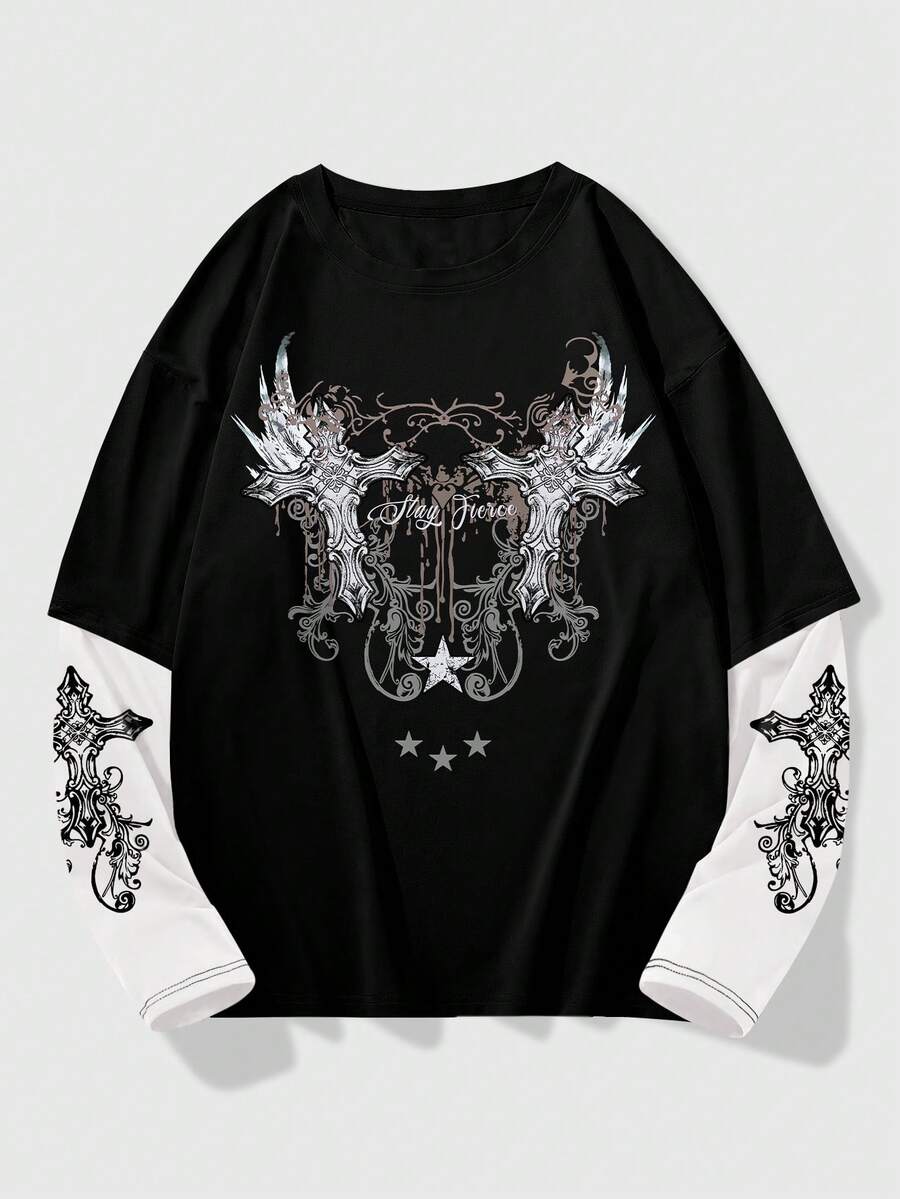 Grunge Punk Camiseta con estampado de cruz y letras para hombres, ideal para Halloween, la escuela, raves, otoño, estilo de los 2000