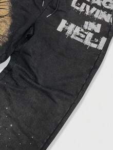 Street Life Pantalones casuales sueltos de pierna ancha con cordón en la cintura, estampado de eslogan y ojo con strass, para hombre, otoño