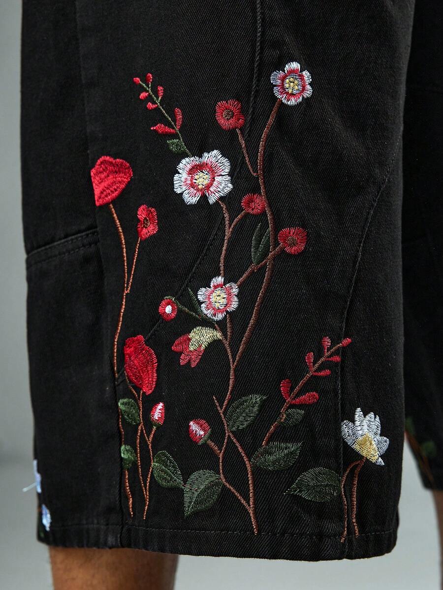 Street Life Pantalones cortos de mezclilla con bordado floral para hombres