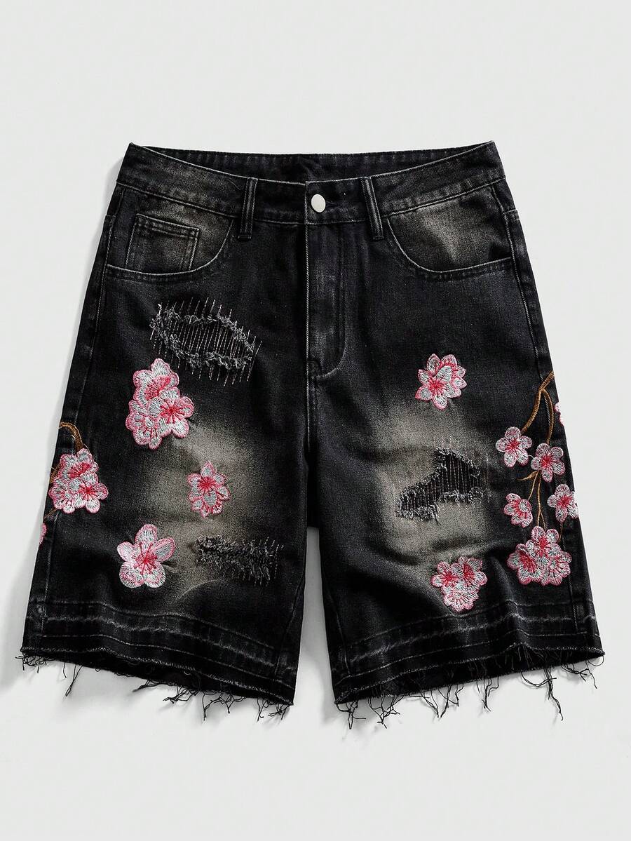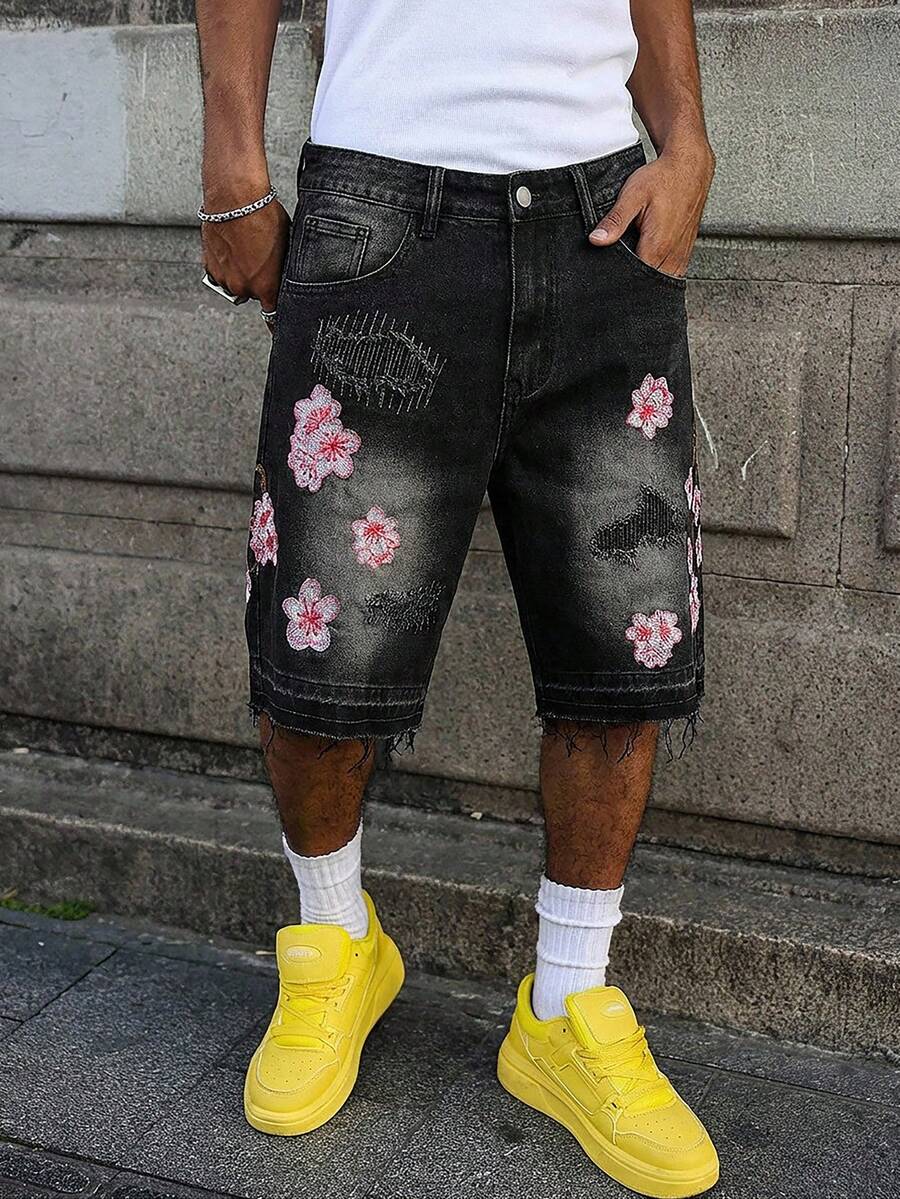 Pantalones cortos de mezclilla casuales con bolsillo bordado floral y desgastados para hombres