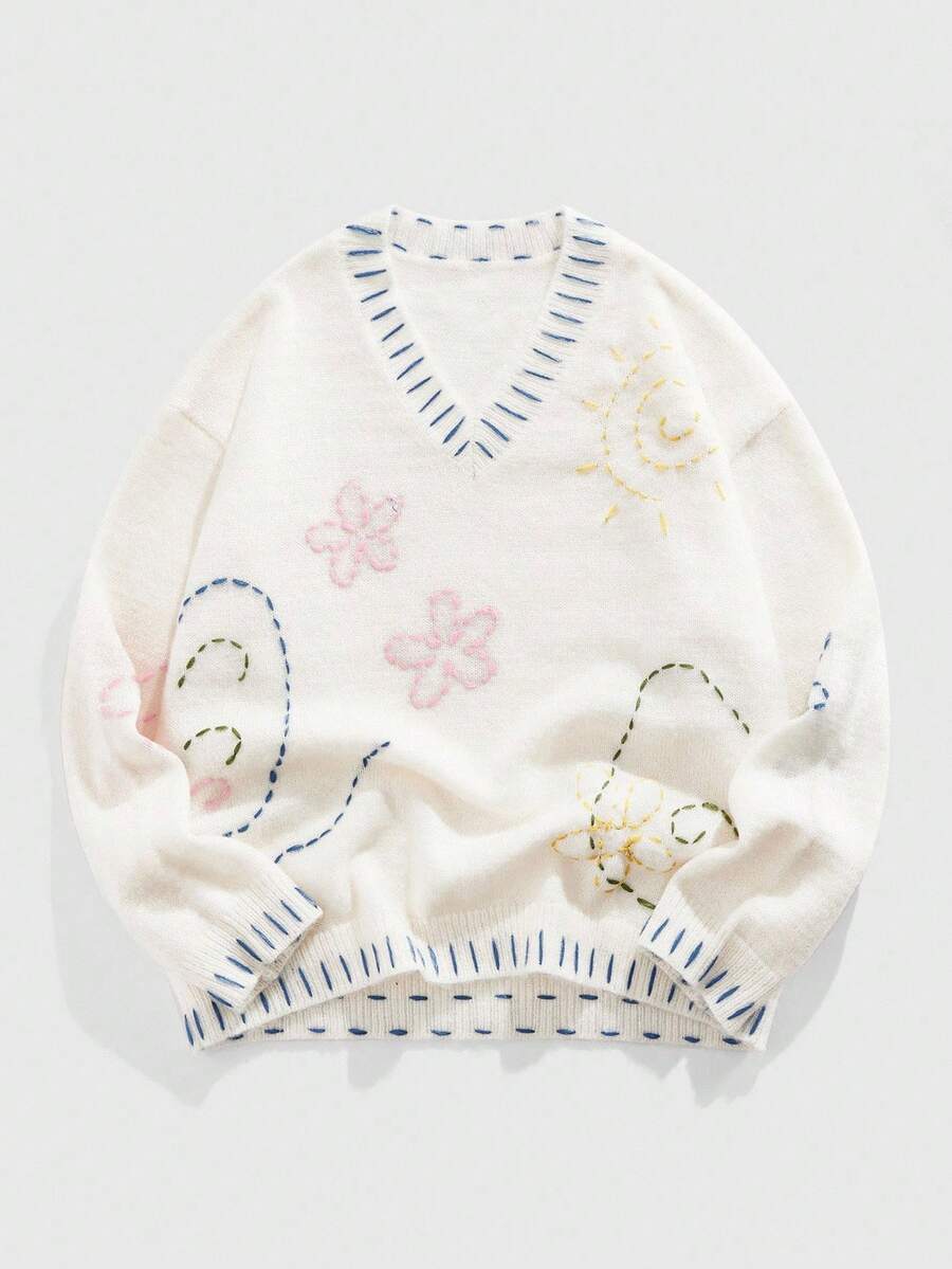 Street Life Suéter casual holgado de manga larga con cuello en V y bordado floral para hombre