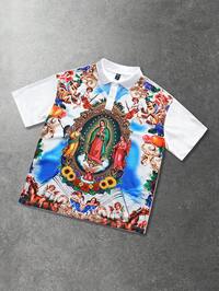 Goth Camiseta de manga corta para hombre con adornos de strass de la Virgen María, apta para uso diario, primavera/verano
