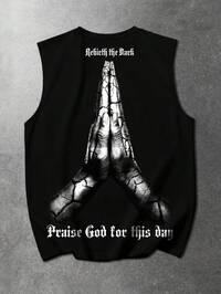 Goth Camiseta de tirantes personalizada de estilo urbano para hombres, con ribete de cobre en puños y cuello, estampado gráfico religioso, perfecta para ropa urbana y festivales de música